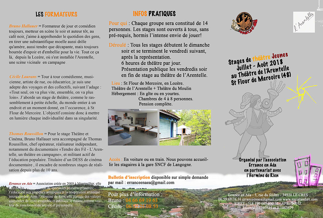 BRUNO HALLAUER : co-fondateur de la Cie l'Hermine de Rien et du théâtre de l'Arentelle, il est comédien et metteur en scène et a créé il y a 35 ans les stages Polymomes qui ont connu un grand succès jusqu'en 2017 où le relais a été transmis à l'équipe d'Errance en Aéa. Il est titulaire d'un BAFD et sera formateur des stages théâtre et cinéma, et théâtre cet été.