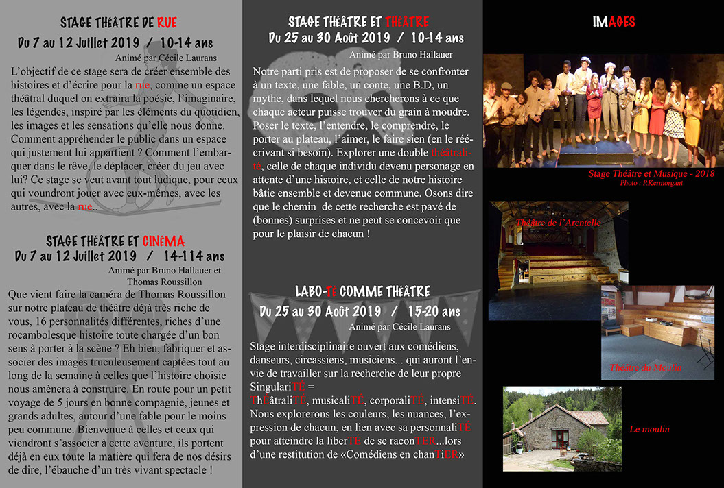 Nous organisons des stages de théâtre pour adolescents et adultes en partenariat avec l'association l'Hermine de Rien à Saint Flour de Mercoire en Lozère depuis 2018. Dans la continuité des stages Polymômes, créés il y a plus de 15 ans par notre partenaire, nous proposons depuis 2 ans, plusieurs temps de recherche individuelle et collective autour du théâtre et d'autres disciplines du spectacle vivant. Des spectacles sont créés et joués en public à l'issue de chaque stage. Le travail s'effectue avec l'accompagnement des formateurs professionnels, dans 2 espaces dédiés = Le théâtre du Moulin (Capacité 50 places) et le Théâtre de l'Arentelle (Capacité 250 places).